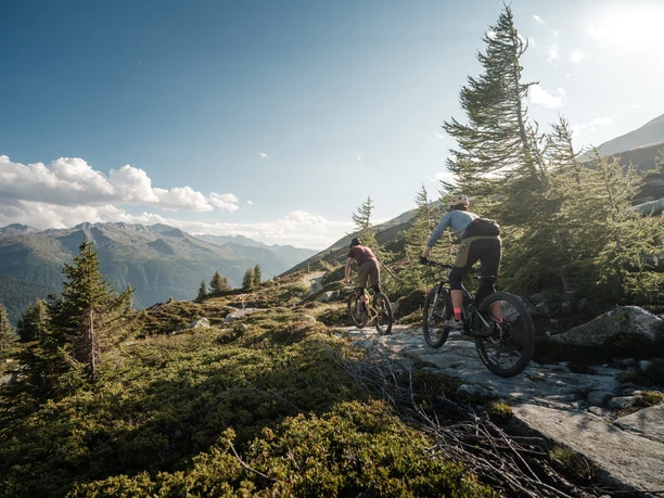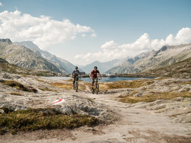 Partez d'Oberwald en car postal et voyagez confortablement jusqu'au point de départ, au col du Grimsel. Passez d'abord devant le lac Totesee, puis empruntez le chemin muletier historique en direction de l'ouest. Des dalles de pierre usées témoignent des innombrables coups de sabots des bêtes de somme. Un sentier d'altitude avec de courtes montées et descentes vous conduira à l'alpage d’Üerlichergale, où vous emprunterez un chemin forestier jusqu'à Ulrichen. Dans un avenir proche, cette descente pourra également être effectuée sur un magnifique singletrail. Après une courte pause pour reprendre des forces, attaquez le véritable défi de la journée : la montée via Chietal jusqu'à Moosmatte. Ceux qui souhaitent raccourcir la montée peuvent prendre le car postal jusqu'à Kittbrigg ou Ladstafel. Une fois en haut, un singletrail récemment aménagé vous mène sur les hauteurs jusqu'à Flesche, d’où vous descendez rapidement sur un trail forestier jusqu'à la vallée, avant de parcourir les derniers kilomètres le long du jeune Rhône jusqu'à Reckingen, votre destination du jour.