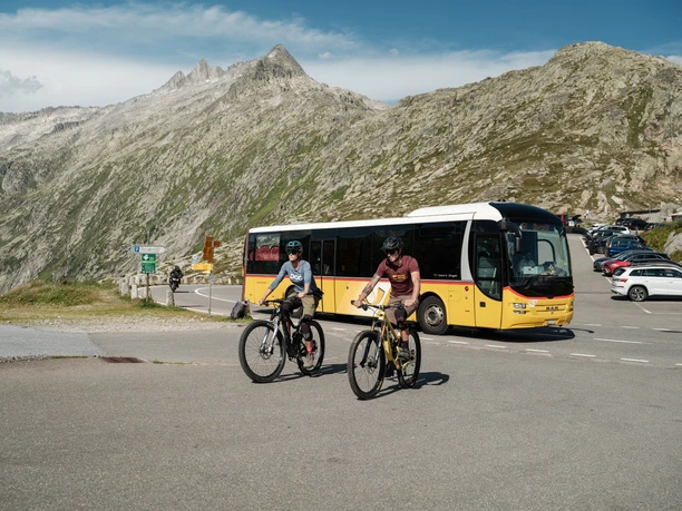 Suivez les indications de stationnement à Oberwald. Pour cette étape de la Valais Panorama Bike (VPB), nous vous recommandons de stationner votre véhicule à Reckingen et de rejoindre le col du Grimsel en transports publics (train régional et bus postal). Pensez à réserver la place pour votre VTT sur la ligne de bus Oberwald-Grimsel sur cff.ch.
