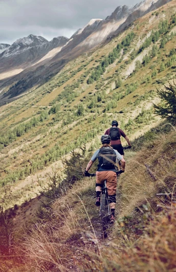 Ab Reckingen fährst du etwa 13 Kilometer entlang des Rhône bis nach Mühlebach auf einem breiten Feldweg und kommst an kleinen Dörfern vorbei, die zum Entdecken gut erhaltener Stätten einladen. Mühlebach, das älteste Holzhauszentrum der Schweiz, wird dich überraschen. Ernen ist nicht weniger beeindruckend: mit seinem wunderschönen Dorfplatz liegt es auf einer Moränen-Terrasse über dem Rhône und hat große historische und kulturelle Bedeutung. Von dort bietet der Aufstieg zur Alp Frid sowohl eine sportliche Herausforderung als auch atemberaubende Ausblicke. Danach durchquerst du das Rappetal, ein naturbelassenes Juwel, der Trail schlängelt sich entlang der Höhenlinie bis Z’Mübach. Du wechselst die Seite des Tals und fährst auf einem Singletrail mit dem Plätschern des Milebachs im Ohr. Vor Fürgangen schiebst du dein Bike über eine spektakuläre Hängebrücke. Die Seilbahn bringt dich nach Bellwald, deinem Tagesziel.